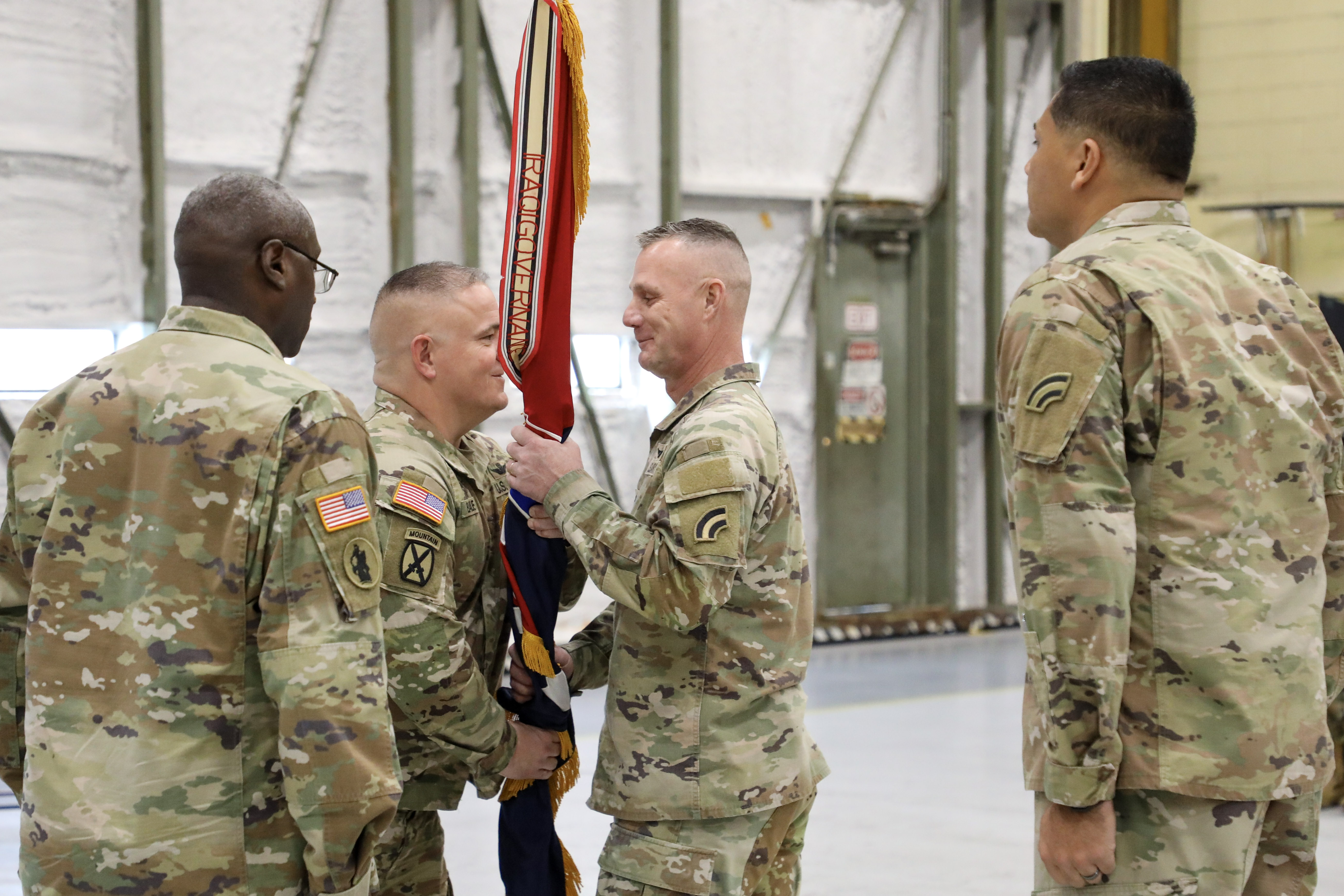 LATHAM --New York National Guard Col. Paul Bailie, the commander of the 42nd Expeditionary Combat Aviation Brigade passes the brigade colors to incoming Command Sergeant Major Dolan Brammer during a change of responsibility ceremony held at the Army Aviation Support Facility in Latham N.Y. on Nov. 14, 2025. The outgoing Command Sergeant Major James Holloman and Command Sergeant Major Dolan Brammer the incoming Command Sergeant Major exchanged responsibility during the ceremony.