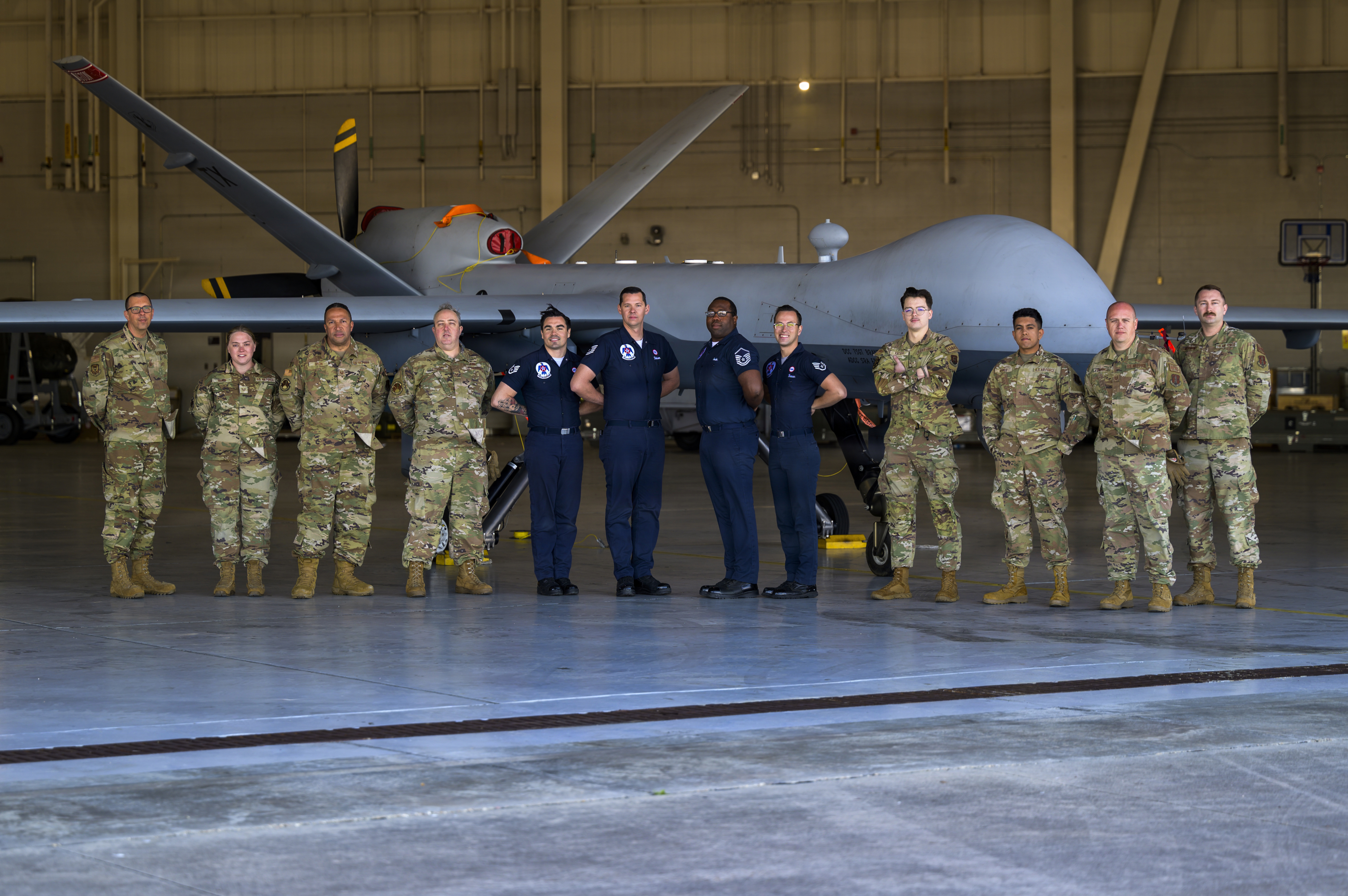 GULFPORT, MISSISSIPPI--New York Air National Guard Airmen assigned to the 174th Attack Wing pose for a photo with the U.S. Air Force Air Demonstration Squadron Thunderbirds crew chiefs during exercise Sentry South 26-2 Gulfport Mississippi Feb. 22 2026. Sentry South 26-2 is a large force employment exercise focused on major combat operations and joint maritime opportunities in a contested or degraded operational environment. Sentry South 26-2 applies joint and combined warfighting doctrine against realistic and robust enemy integrated threat systems all while under safe and controlled conditions.