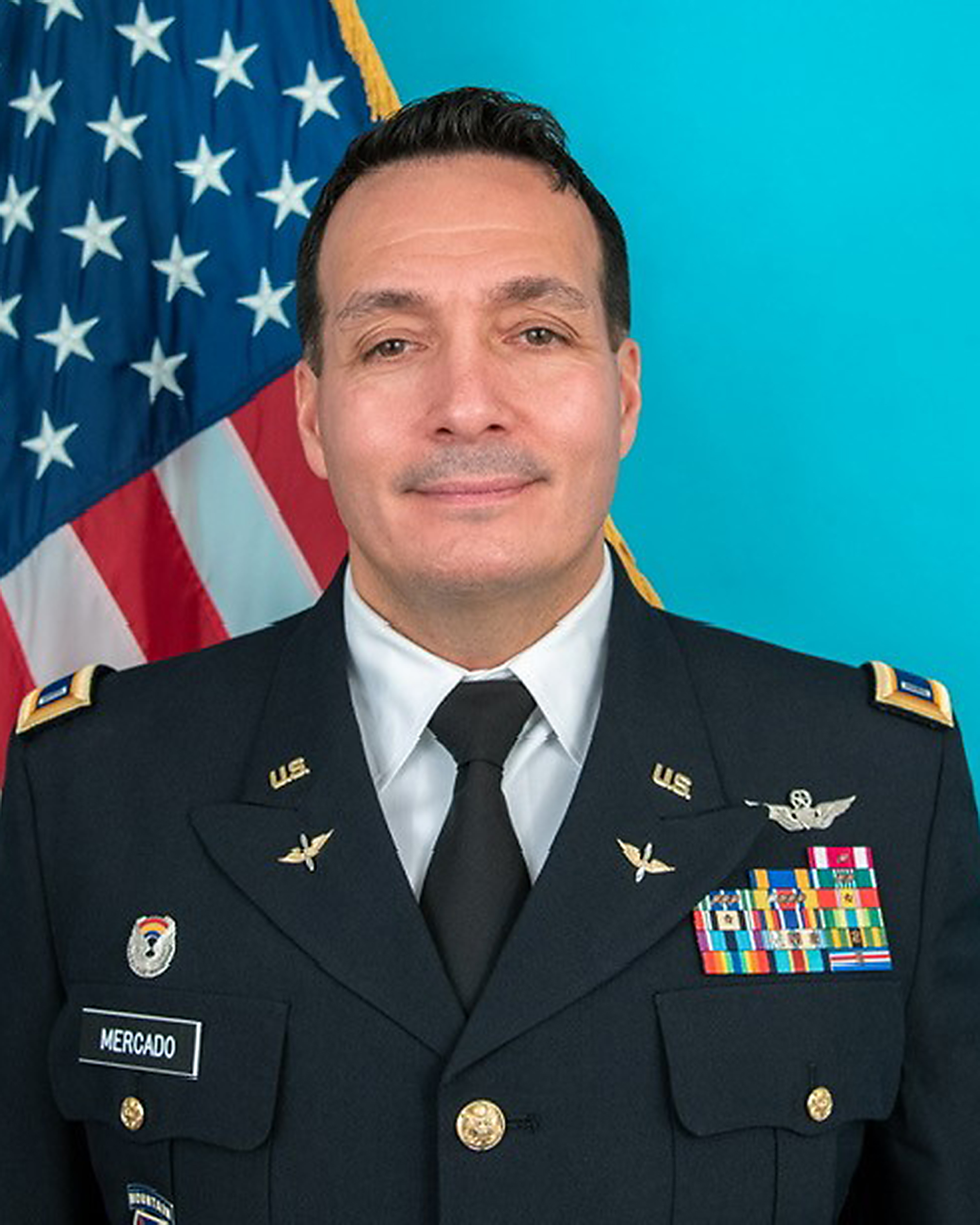 Mercado’s awards include the: Meritorious Service Medal (2nd Award), Air Medal, Army Commendation Medal (3rd Award), Army Achievement Medal (4th Award), Army Reserve Component Achievement Medal (8th Award), National Defense Service Medal (2nd Award), Iraq Campaign Medal with Campaign Star, Global War on Terrorism Service Medal, Armed Forces Service Medal, Humanitarian Service Medal, Armed Forces Reserve Medal with M Device and Silver Hourglass Device, Non Commissioned Officer Professional Development Ribbon (2nd award), Army Service Ribbon, Overseas Service Ribbon, and Army Reserve Components Overseas Training Ribbon (2nd Award). He holds the Master Army Aviator Badge and several state awards.