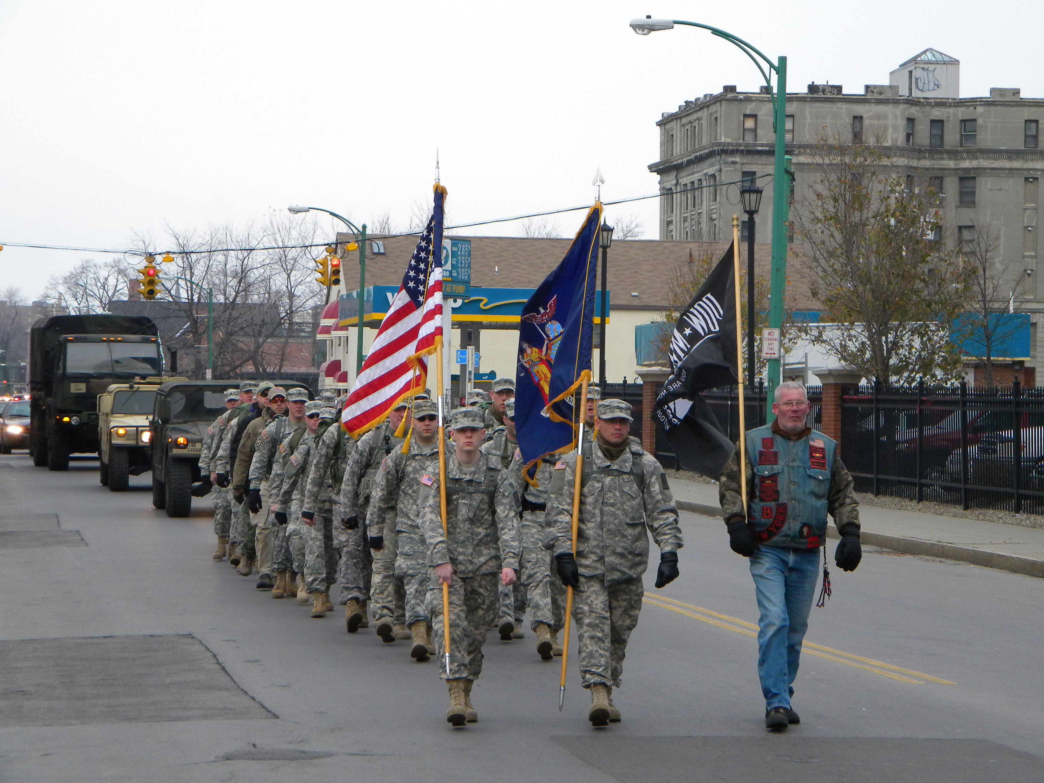 Citizen Soldiers of the New York Army National Guard and Army Reserve march through Buffalo on Saturday, Dec. 5 as they collect food for the Western New York Food Bank.