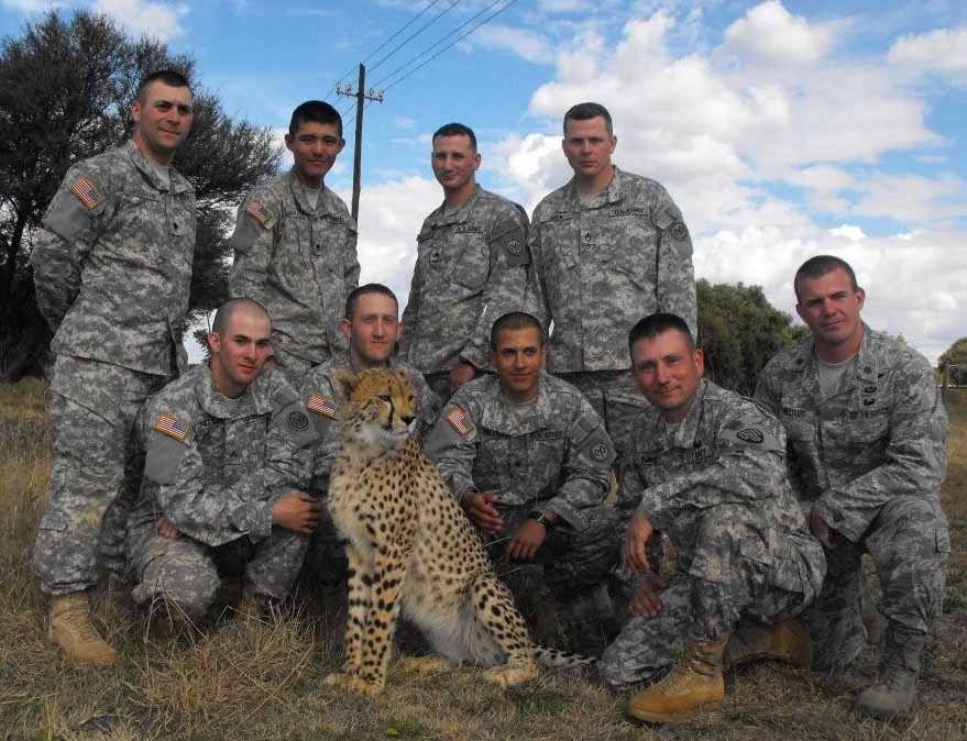 New York National Guardsmen visit with a tame cheetah at a South African game preserve during their recent trip there for the South African National Defense Force 2011 Regional Combat Rifle Competition. Top row, left to right: Spc. Jason Grossman of Airmont, N.Y.; Spc. Masami Yamakado, of New York City; Sgt. Justin Vonderheyde, of Middletown, N.Y.; Staff Sgt. Dennis Rick, of Staten Island, N.Y. Bottom row, left to right: Cpl. Jonathan Patton, of Brooklyn, N.Y.; Staff Sgt. David Cartwright, of Buffalo; Spc. Matthew Melendez, of New York City; Sgt. First Class Arthur Evans, of Saugerties, N.Y.; Maj. Scott Williams, of Long Island. Williams, who is in the Air National Guard, is the bilateral affairs officer for the New York and Republic of South Africa State Partnership Program.