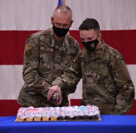 New York Army National Guard Master Sgt Jerry Swan, age 60; and New York Air National Guard Airman 1st Class Emma Davignon, age18, will cut the cake. Traditionally the youngest service member present joins the oldest in cutting the birthday cake.