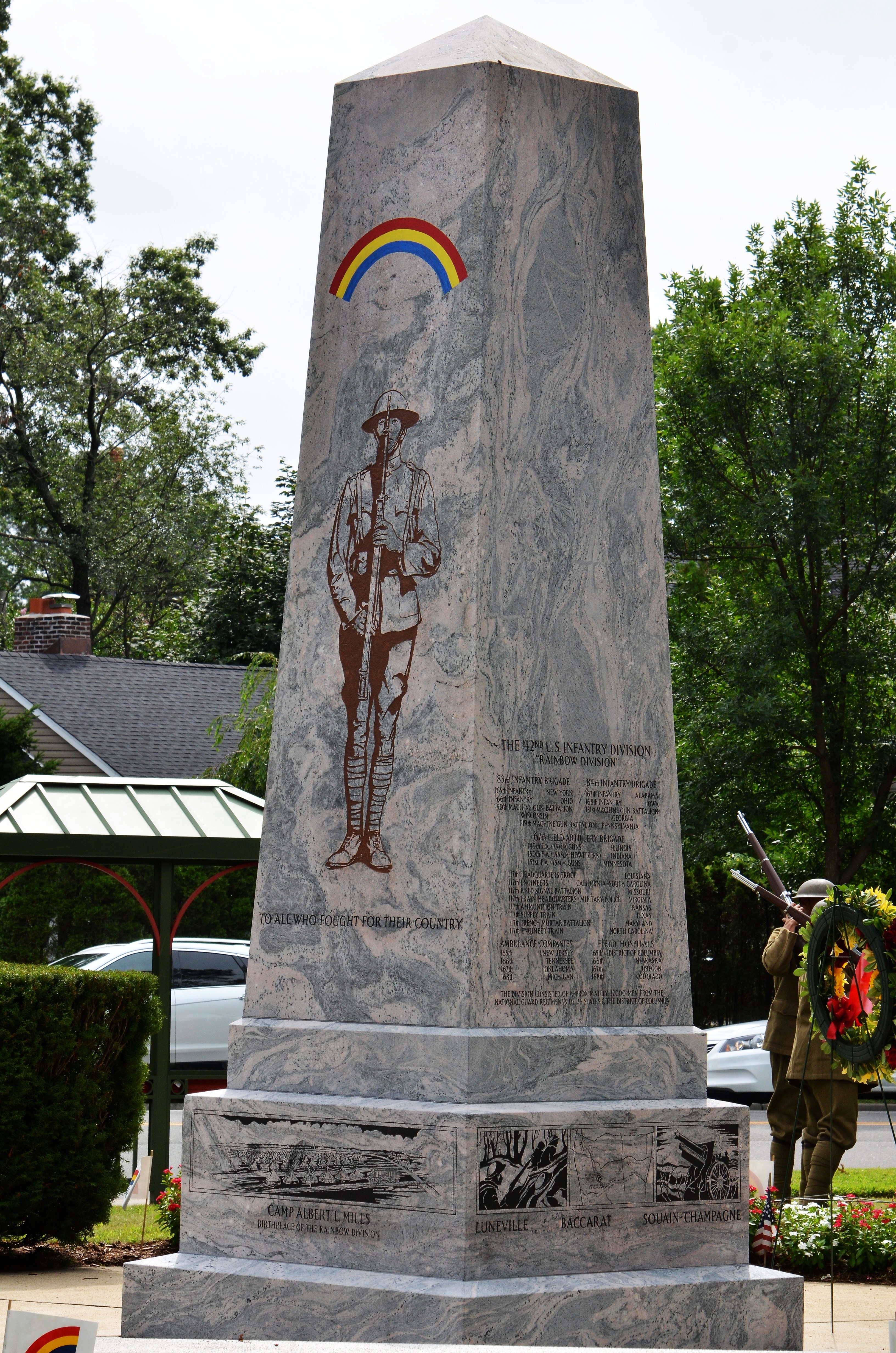 Four Rainbow Division memorials commemorate the unit's birthplace and deployment preparations for war. One is here in Garden City, the site of the Camp Mills preparations for World War I, while the other is located at Camp Gruber, Oklahoma, marking the site of the 42nd Infantry Division's mobilization for WWII. Additional memorials are located at Fort Drum, N.Y. and Fort Dix, N.J., the two training sites for the 42nd Infantry Division's mobilization and training for service in Operation Iraqi Freedom.
