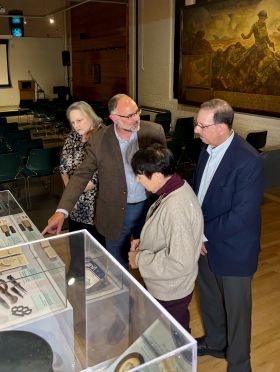 New York National Guard Director of Military History and Military Museum Director Courtney Burns, second from left, discusses artifacts with the Marowitz family members, from left, Linda, Roberta and Larry, during the museum unveiling of a new temporary e