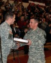 Spc. Joshua Destevens of Oswego, N.Y. receives an encased American flag, a commemorative coin and a certificate of appreciation from his 466th Area Support Medical Company commander, Lt. Col. Richard Green during the unit Freedom Salute ceremony at the Glens Falls High School on Sunday, February 3, 2008. Congresswomen Kirsten Gillibrand, State Senator Elizabeth Little, community and National Guard senior leaders were on hand to recognize the 70 National Guard Citizen-Soldiers and their families from the 466th for their service in support of Operation Iraqi Freedom. The unit returned home from Iraq in October 2007, after operating four separate medical treatment facilities across Iraq. During their year-long deployment, unit personnel completed more than 30,000 medical visits, ranging in patient care from minor aches, pains and illnesses to extremely serious battlefield injuries and trauma. More than 40,000 prescriptions were filled for patients in the 466th Medical Company facilities. U.S. Army photo by Master Sgt. Corine Lombardo. (RELEASED).
